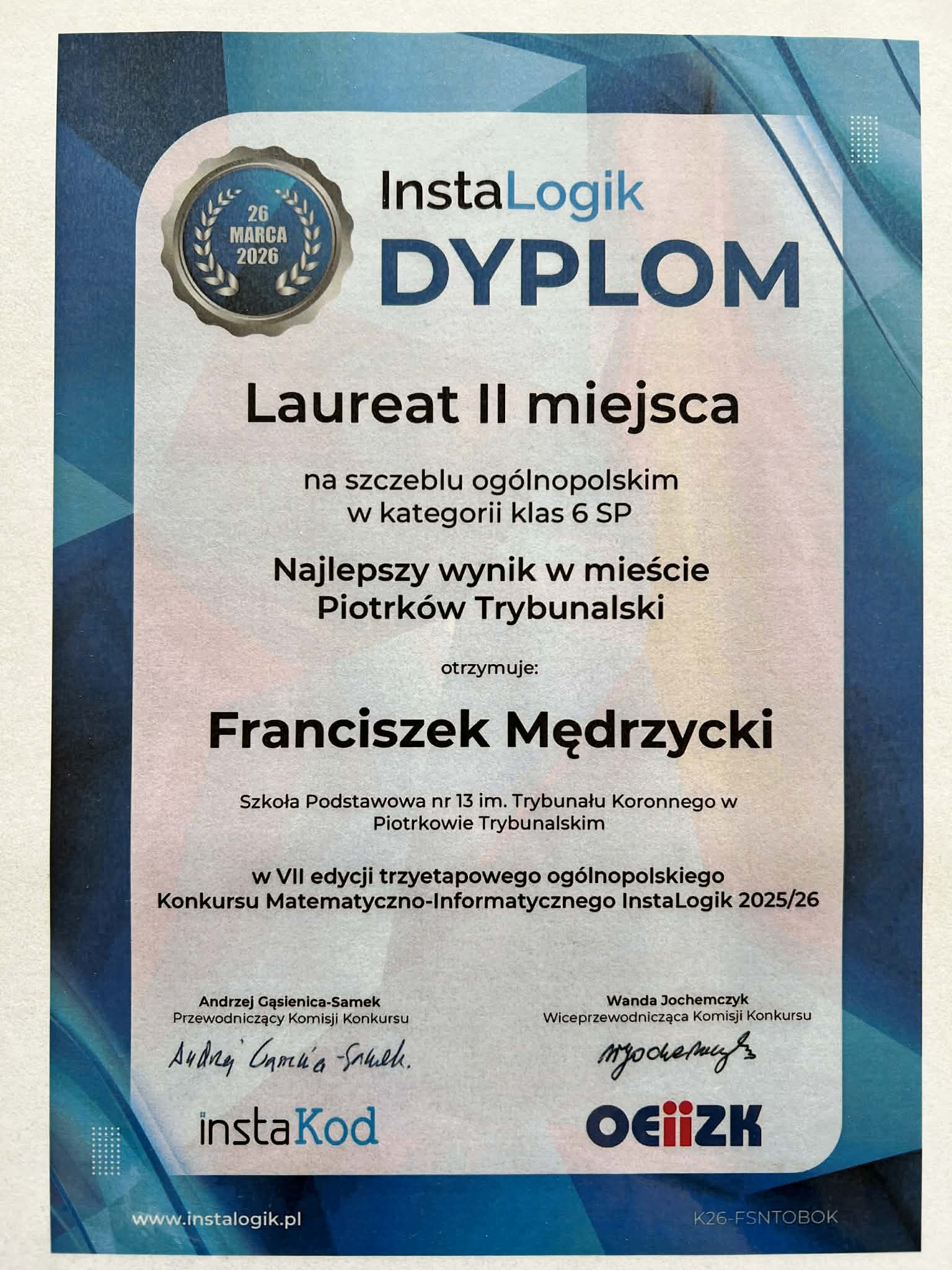 Z ogromną dumą informujemy, że Franciszek Mędrzycki zdobył II miejsce na szczeblu ogólnopolskim w konkursie InstaLogik!